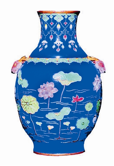 仿琺華亦稱琺花器或法花器,是一種以藍(lán)、綠、黃、紫、白等多種釉色為基調(diào)的低溫彩釉陶瓷器。它是在陶胎表面用帶管的泥漿袋勾勒出凸線的紋飾輪廓,分別以各種色料填出底子和花紋,入窯燒成。這件清代乾隆年間仿琺華蓮池水禽紋雙鹿耳罐,高27.6厘米,瓶撇口,細(xì)頸,肩模印凸起一道弦紋,腹部呈橢圓形,圈足。內(nèi)施松石綠釉,口沿下和肩部分別飾如意云頭一周,頸飾瓔珞紋,肩兩旁各飾一鹿首為耳。腹部蓮花荷葉迎風(fēng)招展,一對白鷺佇立塘中,一派恬靜疏朗的景觀。而鷺鷥纖小,花葉碩大,更呈現(xiàn)出蓮塘之寬闊,大氣磅礡,色澤鮮艷,和諧悅目。