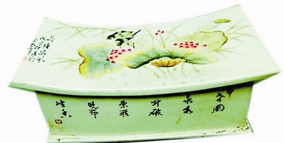 瓷枕是我國古人夏日納涼的寢具。瓷枕始見于隋代,盛行于唐宋,李清照名篇《醉花陰》中“薄霧濃云愁永晝,瑞腦消金獸。佳節(jié)又重陽,玉枕紗櫥,半夜涼初透”的詞句,形象地將青白釉瓷枕喻為“玉枕”。這件民國粉彩荷花瓷枕,長24厘米,寬10.2厘米,高10.7厘米,是一幅鴛鴦戲水荷花圖,兩只鴛鴦棲水而戲,身下泛起層層漣漪。水面上的荷葉舒展自如,隨風(fēng)搖曳,三朵粉紅色荷花,或含苞欲放,或綻放爭艷,讓人心馳神往,遐思翩翩。此瓷枕胎質(zhì)純白,造型優(yōu)美,制作細(xì)膩,構(gòu)圖疏朗,畫工精細(xì),色彩瑰麗。細(xì)細(xì)摩挲,仿佛一縷縷淡雅的幽香拂面而來,溫馨宜人,讓人頓感心靜涼爽。