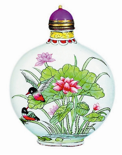 圖三:銅胎畫琺瑯蓮池鴛鴦鼻煙壺