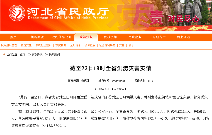 今年7月18日開(kāi)始,河北遭遇到巨大災(zāi)難。據(jù)河北省政府官網(wǎng)消息,截止23日18時(shí),全省11個(gè)設(shè)區(qū)市的149縣(市、區(qū))和定州市、辛集市受災(zāi),受災(zāi)人口904萬(wàn)人,因?yàn)?zāi)死亡114人、失蹤111人,緊急轉(zhuǎn)移安置30.89萬(wàn)人,倒塌房屋5.29萬(wàn)間、損壞房屋15.5萬(wàn)間,農(nóng)作物受災(zāi)面積723.5千公頃,絕收面積30千公頃,因?yàn)?zāi)造成直接經(jīng)濟(jì)損失已達(dá)163.68億元。