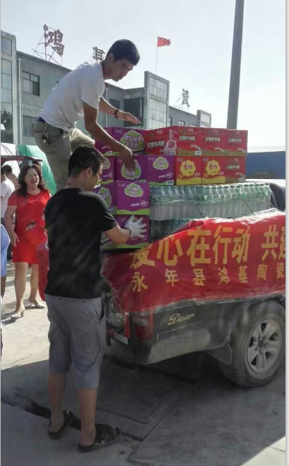 天災(zāi)無(wú)情,人間有愛(ài)。位于河北省永年縣的河北鴻基陶瓷有限公司董事長(zhǎng)黃國(guó)汀、夏惠鳳、董行樹(shù)等公司高層對(duì)這次受災(zāi)高度重視,每天派人在各區(qū)和村及時(shí)的不停給當(dāng)?shù)貫?zāi)民送溫暖,把大米、油、方便面、火腿腸、消毒液等急需物質(zhì)及時(shí)送到災(zāi)民身邊。