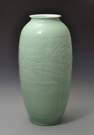 二〇一二年四月夏侯水平作品;龍泉青瓷梅子青(鴛鴦戲荷廣口瓶)參加由中國中國工藝美術館,中國國家博物館承辦的{中國當代工藝美術雙年展}