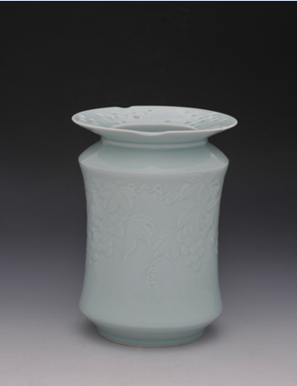 夏侯水平作品:造型新穎,釉色純正如玉,手工拉坯成型,裝飾到位,以葡萄小雞為題,彰顯農村自然風貌,畫面采用陽刻真實自然,給人以濃郁的鄉(xiāng)風民俗美好光景。