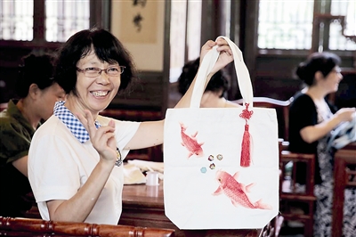 “雙魚戲珠”“鳥語花香”“鯉魚躍龍門”……學員們發(fā)揮著自己的想象,一針一線,在環(huán)保袋上任意穿梭。原本普通的袋子煥發(fā)了新生命,變得精致靈動,形成一幅幅生動的畫面。
