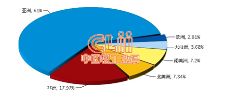 圖1 2016年1~6月我國陶瓷磚累計(jì)出口額各大洲占比情況
