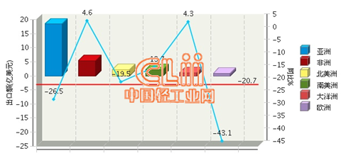 圖2 2016年1~6月我國陶瓷磚累計(jì)出口額各大洲同比情況