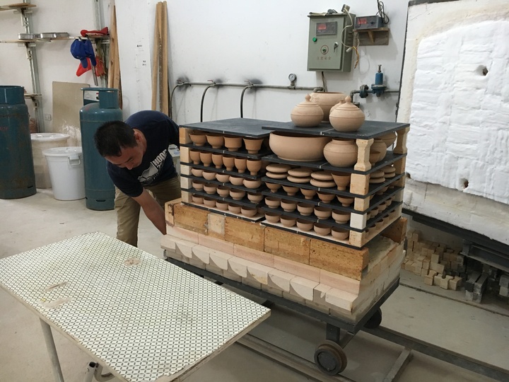 許繼武既是這家店的老板,也是燒瓷能手。在他的指引下,我們看到一個像雙開門冰箱大小的機器在呼呼作響,原來這就是我們很想看的燒窯之地。