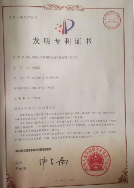 原來一個成品出爐并不是一件簡單的事情,需要耐心,更需要專研。據(jù)了解,許繼武還發(fā)明了一種叫做哥釉與弟釉相結(jié)合的青瓷燒制工藝方法,并申請獲得了發(fā)明專利呢!