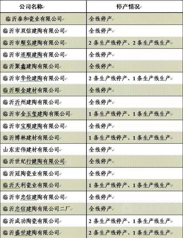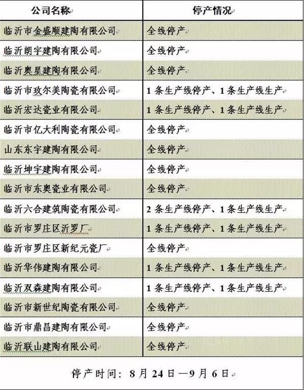 9月4日至9月5日,G20峰會將在杭州召開。期間,臨沂市將對建陶企業(yè)實行停產(chǎn)、限產(chǎn)。據(jù)悉,羅莊區(qū)共有55家陶瓷企業(yè)被停產(chǎn)、限產(chǎn),涉及62條生產(chǎn)線,停產(chǎn)時間從8月24日至9月6日,共計14天。