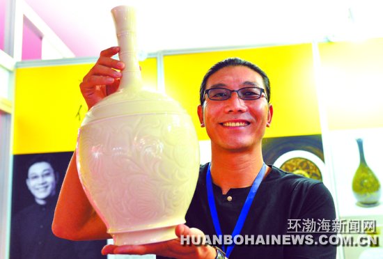 薛行嶙是70后,灤南人,梳著個長辨子,頗有藝術(shù)家的風范。他畢業(yè)于河北省輕工業(yè)學校,目前在河北曲陽任定瓷研究所所長,還開辦了一家公司。他的獲獎作品是一個白釉剔花紙槌瓶,薛行嶙介紹說,這個瓷瓶有3個特點,一是剔花工藝精美、刻工精湛;二是釉色溫潤,體現(xiàn)了定窯白釉的優(yōu)點;三是造型獨特,是他的原創(chuàng)。