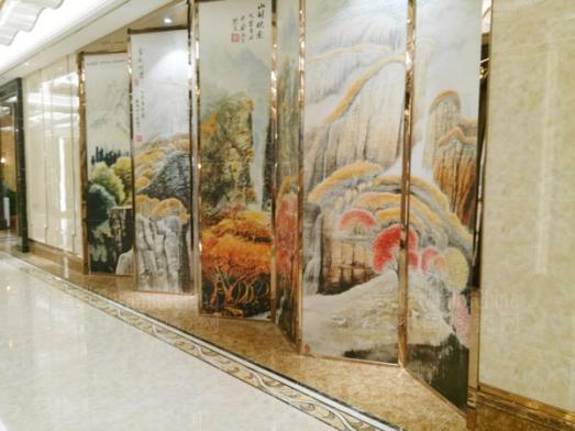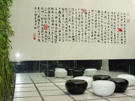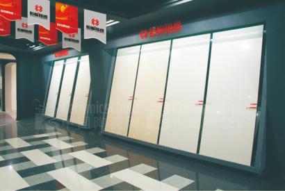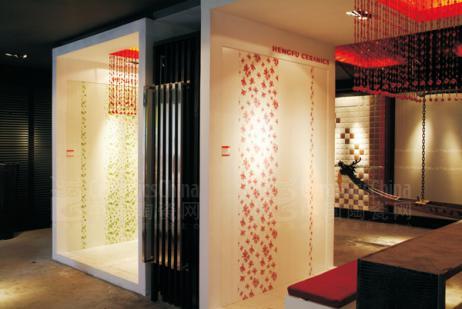 新展廳大量運用了中國山水瓷藝畫、中式屏風、青銅鳥籠燈、不銹鋼窗格等元素來展示瓷磚的藝術殿堂。走進面積達250平方的中空大堂,左右兩邊的中國山水瓷藝畫相互輝映,加上不銹鋼窗格在旁點綴裝飾,整個大堂格調高雅,氣勢蓬勃。