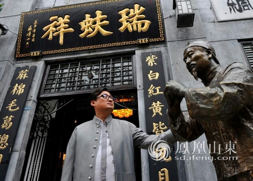 下午,鳳凰全媒體走進周村大街,體驗古代商業(yè)街文化,探尋魯商源地時,恰逢孟洛川第五代孫孟慶鋼在周村大街新開了一家“孟洛川”旗袍訂制門店,位置就在瑞蚨祥老號里。