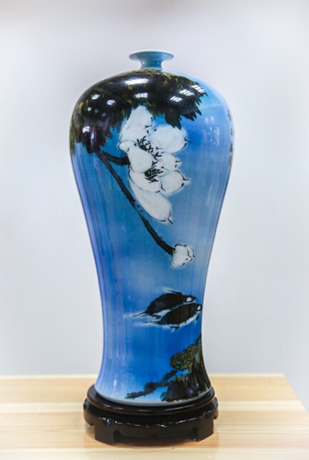 徐美蘭在本次展覽展出的代表作品中。其中蓮塘秋水為顏色釉瓷蓮子瓶,為景德鎮(zhèn)四大名瓷。蓮塘秋水造型典雅,線條流暢,極富質(zhì)感。作品以天藍(lán)色為底色,黑色勾勒輪廓,白色繪成蓮花作點(diǎn)晴之筆。整個(gè)作品釉彩飽滿(mǎn),張力十足,筆法細(xì)膩,極富想象力,藍(lán)色與黑色的大膽結(jié)合,形成反差美感,將秋水、蓮花躍然于瓶上,賦予陶瓷全新生命力,作品讓人過(guò)目不忘。