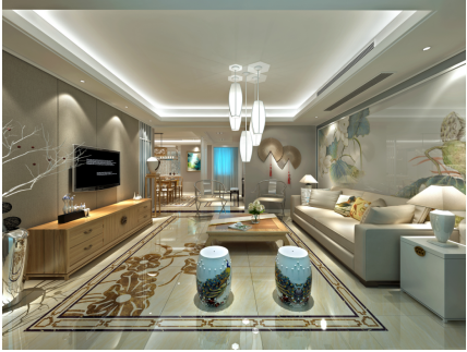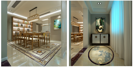 張先生進店以后,他沒有著急看產品,而是坐在休閑區(qū)翻看我們的家裝寶典和戶型設計案例。于是我就為他先做設計方面的介紹,根據他的戶型圖,從《強牌家裝寶典》里挑選幾套戶型接近但風格不同的效果為他分析。張先生和張?zhí)瑫r選中了一套新中式的效果圖,但是張?zhí)珔s提出希望能把她鐘愛的幾幅水墨作品融入到各空間的地面設計中。
