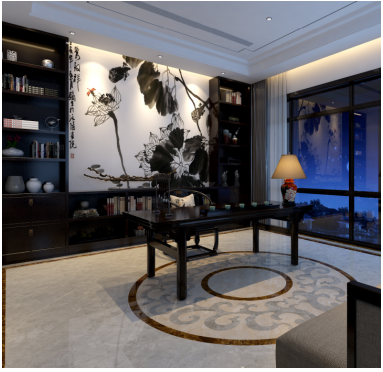 但為了滿足用戶的需求,我還是決定接受這個挑戰(zhàn),先看了張?zhí)x的幾幅畫,大部分是荷花題材的水墨作品。于是,我嘗試著以手繪素描的形式臨摹出部分荷花的形態(tài),再把這些手繪元素應用到玄關、形象墻、客餐廳地面、畫室等空間。這樣,一方面利用“荷花”元素讓全屋設計的空間風格更加統一;另一方面也能利用水刀加工的技術也把張?zhí)蟮乃璞憩F出來。