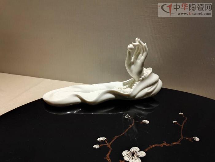 許氐第六代傳人許瑞卿作品,采用德化優(yōu)質(zhì)高嶺土,瓷質(zhì)潔白,溫潤(rùn)如玉。衣袖飄逸自然成托,佛手捻珠以為香插,極富禪意。