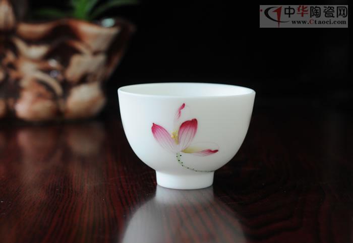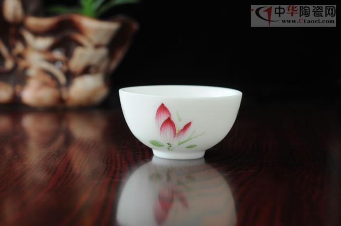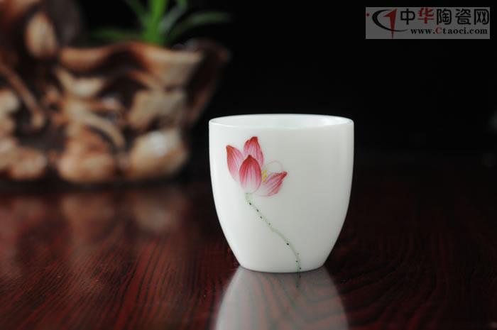 作品采用特級德化白瓷高嶺土,3萬/噸。手工玉瓷杯,珠圓玉潤,執(zhí)杯在手,光潤潔白,如脂似玉,手感極佳,令人愛不釋手,作品胎骨潔白,堅(jiān)實(shí)致密,有凝脂似玉之感,迎光透視,色澤光潤明亮,晶瑩剔透,杯身手繪荷花,清新淡雅,集實(shí)用性、觀賞性、收藏性于一體,是品茗佳選。