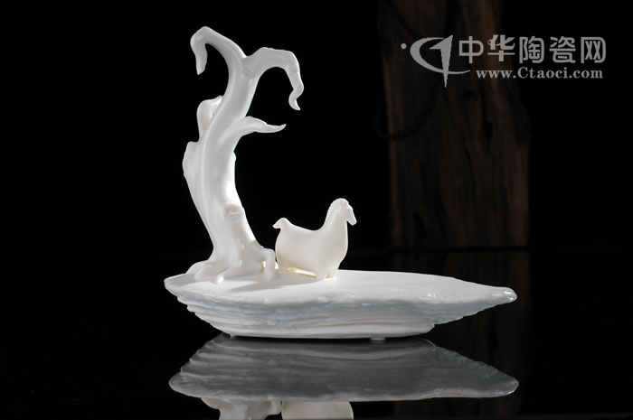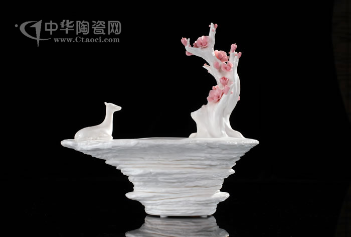 新銳青年陶藝家鄭清海作品,風(fēng)化狀的巖石上,平滑如鏡,一株梅花傲立枝頭,一頭小鹿乖巧凝視。作品以德化白瓷為表現(xiàn)形式,素雅自然,純手工捏制的梅花使作品更為精細(xì)。
