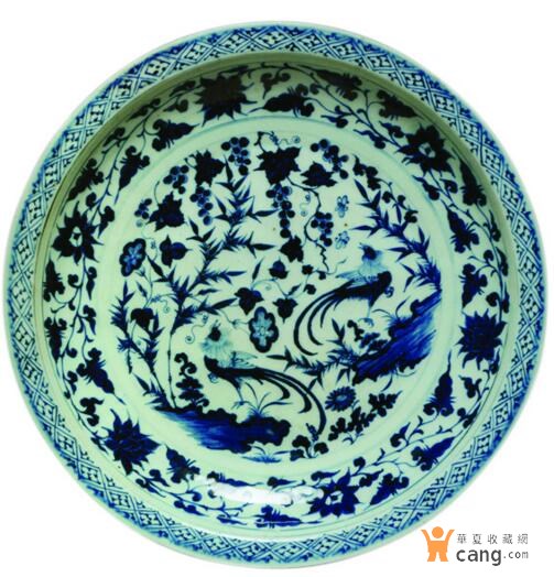 V·A博物館六樓瓷器展廳,玻璃柜內(nèi)赫然擺放著一坨海撈瓷殘片(圖1),應(yīng)屬于我國明代輸出的青花瓷盤,別稱為克拉克瓷。明代早期,瓷器的大量輸出與鄭和八次遠(yuǎn)航有密切關(guān)系。瓷器輸出的另一方式是“入貢”國家使節(jié),回國時帶回的。對中國精美的瓷器,世界各國人士愛不釋手,尤其是青花瓷器,幾乎遍及亞、非、歐、美各洲。當(dāng)然中國的制瓷業(yè)也從國外獲得物質(zhì)、技術(shù)和藝術(shù)上的借鑒與幫助。習(xí)近平主席今年1月21日在《伊朗報》發(fā)表《開創(chuàng)中伊關(guān)系美好未來》一文中指出:“來自伊朗的蘇麻離青和中國的高超工藝結(jié)合,成就了青花瓷的雅致。”元青花瓷器應(yīng)當(dāng)是V·A博物館陶瓷展廳展示的強項,元青花展品總計有七件之多,品種包括龍紋皿系扁壺、牡丹紋八棱大罐、海水紋花口大盤、鴛鴦戲水滿池嬌花口盤、青花雉雞竹石花果紋盤(圖2)等典型標(biāo)準(zhǔn)器。