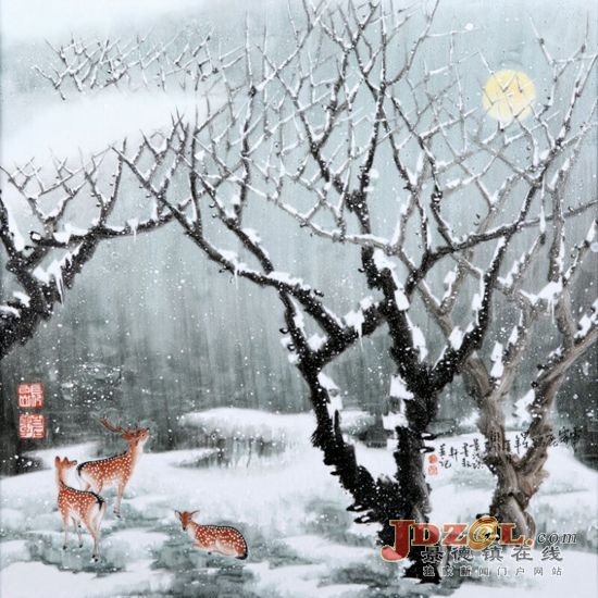 《雪霽鹿鳴》粉彩瓷板