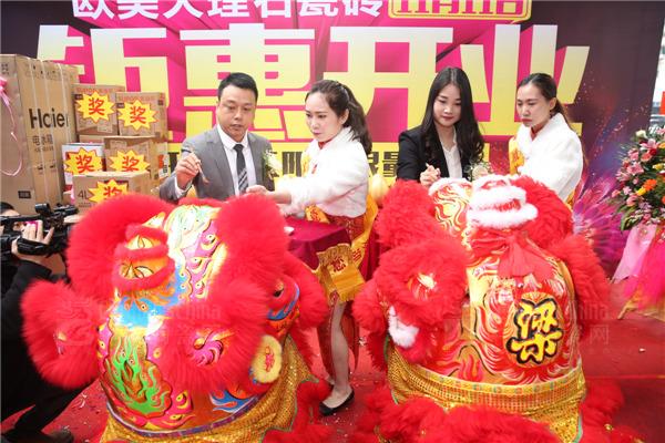 歐雅企業(yè)工程事業(yè)中心總經(jīng)理嬈良文、三水歐美陶瓷旗艦店董事長潘秋萍共同為瑞獅點睛