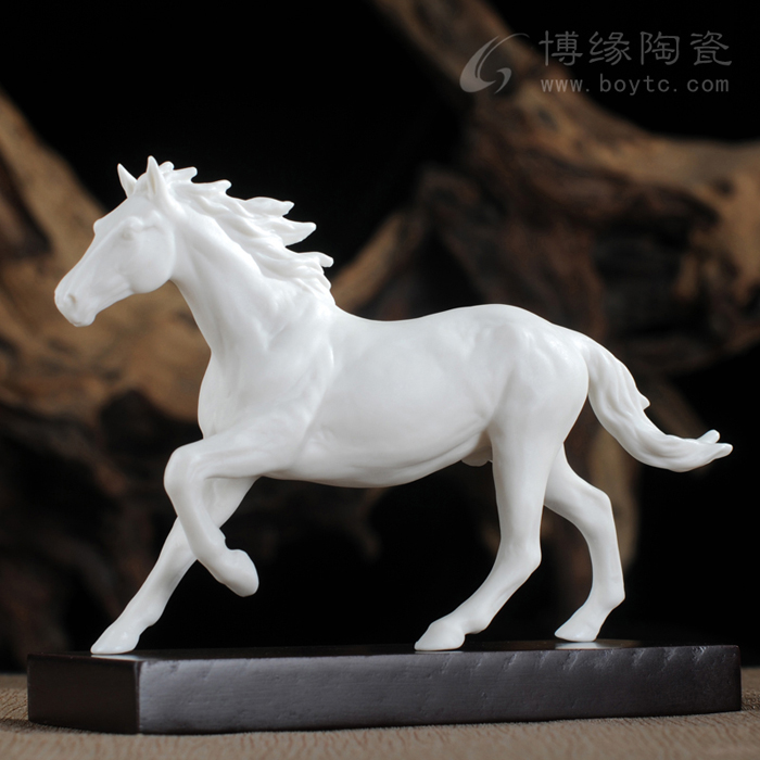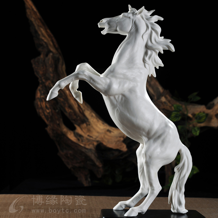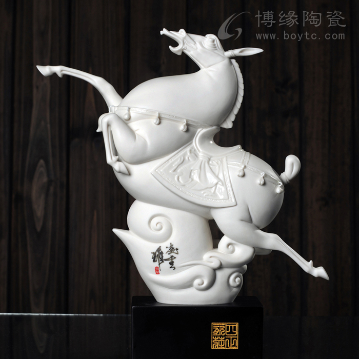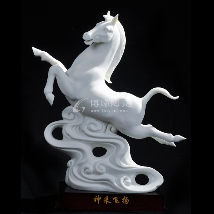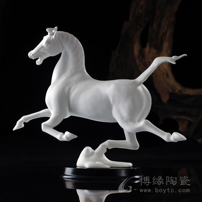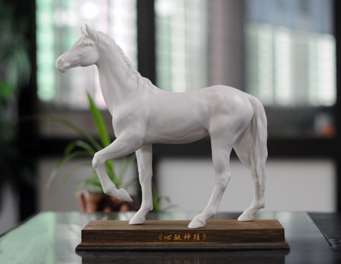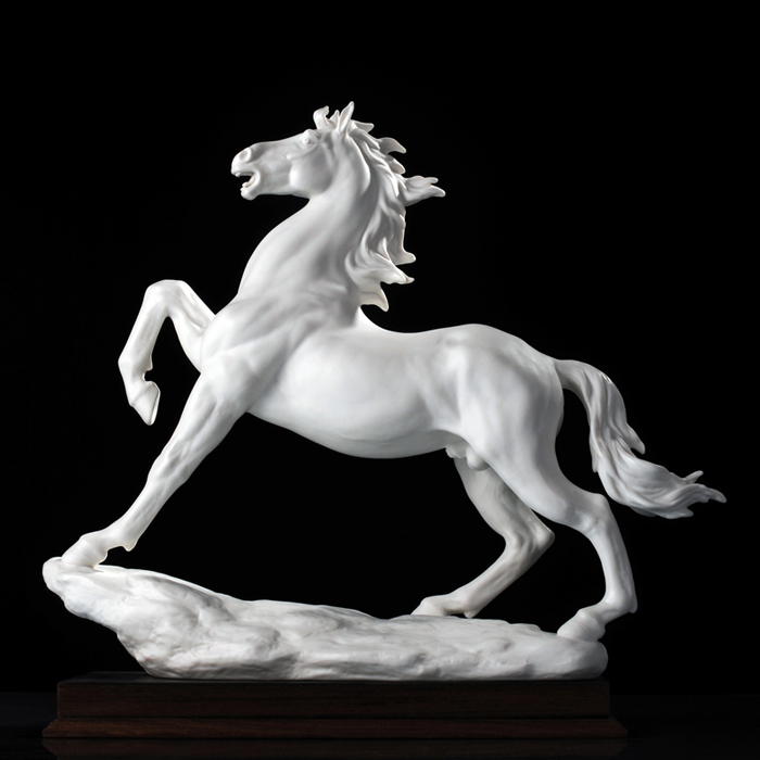 但凡了解瓷塑的人都知道,由于瓷器要經(jīng)過一千多度高溫的燒煉,最高溫時(shí)的瓷胎會(huì)呈現(xiàn)一種熔融狀態(tài),如果胎體重心不穩(wěn),燒煉中極容易變形甚至癱倒成為廢品,因此瓷塑的底部從工藝角度講,應(yīng)該越敦實(shí)越好。尤其對(duì)馬的四條細(xì)長(zhǎng)腿,瓷塑家都會(huì)盡量避免如實(shí)塑造。這樣四蹄飛揚(yáng)的瓷馬----四只翻飛的馬蹄都交代得清清楚楚,站立得穩(wěn)穩(wěn)當(dāng)當(dāng),實(shí)屬難能可貴!