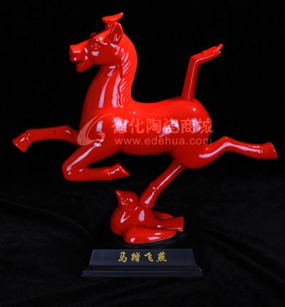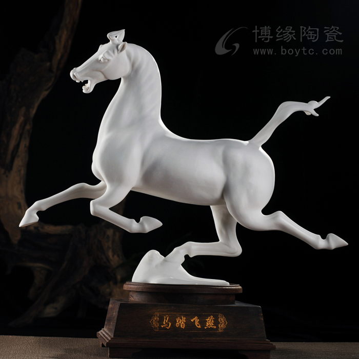 “馬踏飛燕”原文物是一件青銅器,青銅質(zhì)材單腿曲立當(dāng)然就沒有工藝難度,何況不經(jīng)火燒。而這件瓷塑“馬踏飛燕”,造型精準(zhǔn)不說,居然靠著一條細(xì)而彎曲的腿撐住了馬的碩大身體,并經(jīng)過千度以上高溫火的洗禮而毫無失重感,簡(jiǎn)直讓人不可思議!