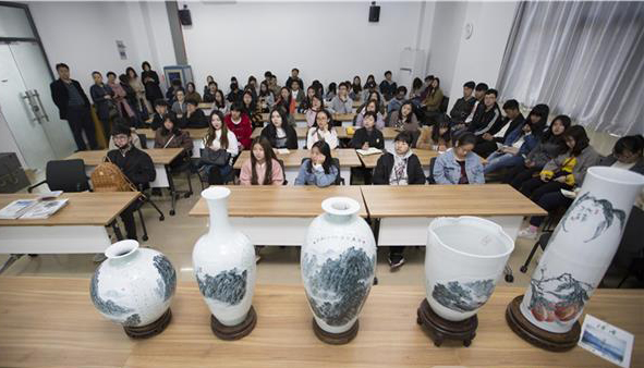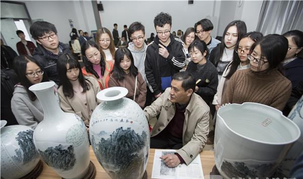 2017年3月27日,在南京林業(yè)大學(xué)藝術(shù)設(shè)計(jì)學(xué)院,畫(huà)家劉越勝為大學(xué)生們講述畫(huà)青花的體會(huì)。當(dāng)日,南京林業(yè)大學(xué)藝術(shù)設(shè)計(jì)學(xué)院舉辦學(xué)術(shù)講座,首次邀請(qǐng)畫(huà)家為大學(xué)生們講述畫(huà)青花的體會(huì),讓大學(xué)生們近距離了解“瓷以畫(huà)傳,畫(huà)以瓷傳”的無(wú)窮魅力。