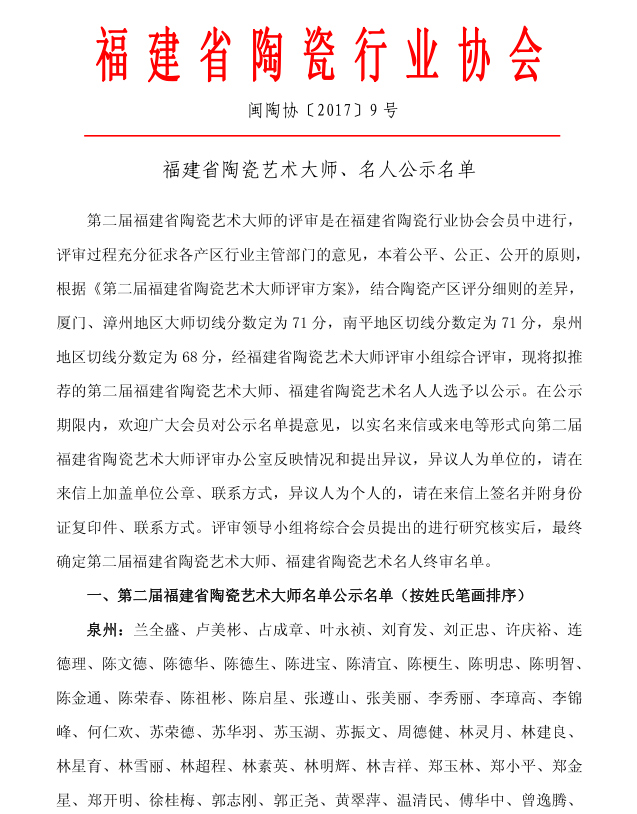 第二屆福建省陶瓷藝術(shù)大師的評審是在福建省陶瓷行業(yè)協(xié)會會員中進行、評審過程充分征求各產(chǎn)區(qū)行業(yè)主管部門的怠見,本著公平、公正、公開的原則, 根裾《第二屆福建省陶瓷藝術(shù)大師評審方案》,結(jié)合陶瓷產(chǎn)區(qū)評分細(xì)則的差異,廈門、漳州地區(qū)大師切線分?jǐn)?shù)定為71分,南平地區(qū)切線分?jǐn)?shù)定為71分,泉州地區(qū)切線分?jǐn)?shù)定為68分,經(jīng)福建省陶瓷藝術(shù)大師評審小組綜合評審,現(xiàn)將擬推薦的第二屆福建省陶瓷藝術(shù)大師、福建省陶瓷藝術(shù)名人人選予以公示。在公示期限內(nèi),歡迎廣大會員對公示名單提意見,以實名來信或來電等形式向第二屆福建省陶瓷藝術(shù)大師評審辦公室反映情況和提出異議,異議人為單位的,請在來信上加蓋單位公章、聯(lián)系方式,異議人為個人的,請在來信上簽名并附身份證復(fù)印件、聯(lián)系方式。評審領(lǐng)導(dǎo)小組將綜合會員提出的進行研究核實后,最終確定第二屆福建省陶瓷藝術(shù)大師、福建省陶瓷藝術(shù)名人終審名單。