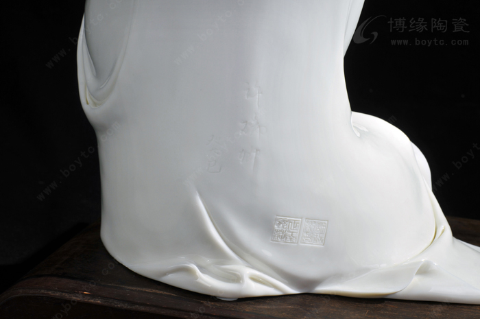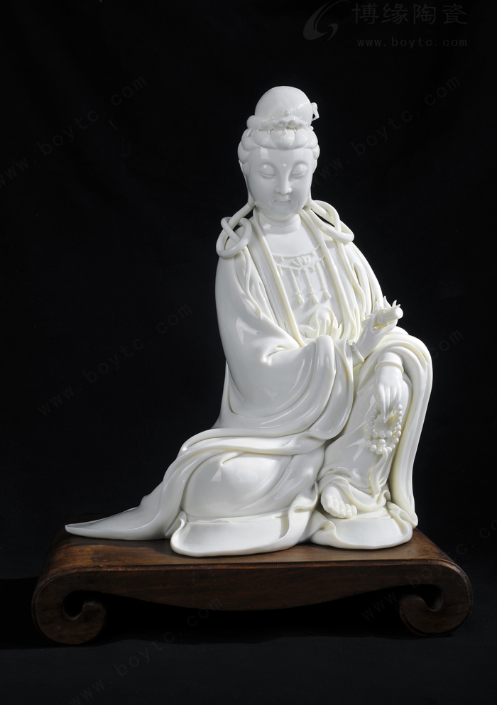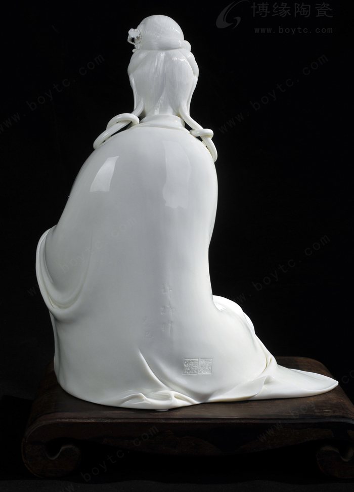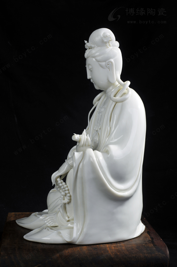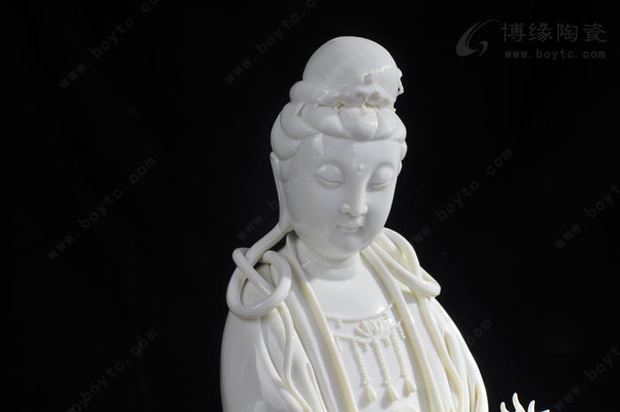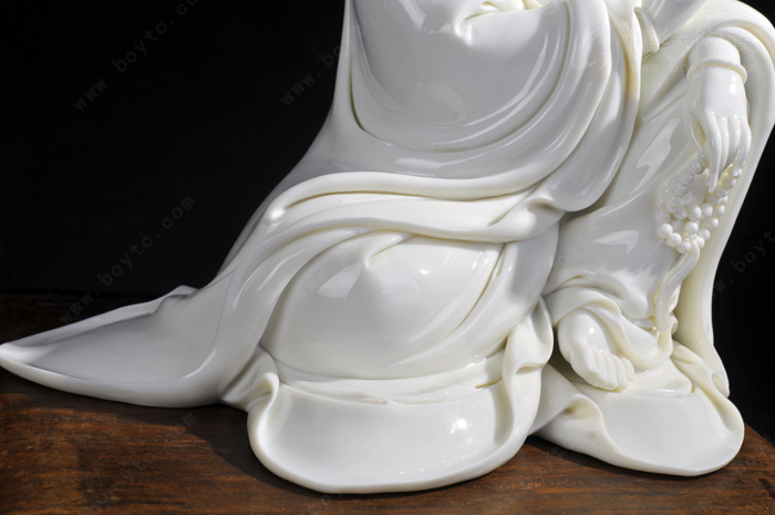 《持經(jīng)觀音》以德化特有的溫潤如玉的“中國白”為胎質(zhì),純手工制作,所塑人物性格鮮明,造型優(yōu)美,神態(tài)逼真,風(fēng)格洗練。