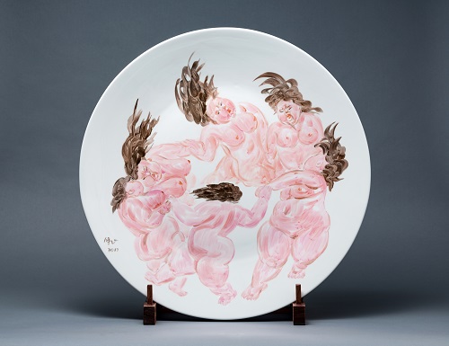 許鴻飛瓷碟畫的原創(chuàng)性是其逆勢生長的沃土,也是水到渠成的必然。千百年來我國陶瓷藝術(shù)由粗到細(xì),工藝技法與材料應(yīng)用愈加多樣復(fù)雜乃至趨向極致化和程式化。許鴻飛主要選用1200℃至1300℃左右的窯燒碟式白瓷坯,用環(huán)保色料繪制圖案后,再以800℃左右的溫度進(jìn)行二次窯燒而成,屬于釉上彩。盡管之前沒有接觸過陶瓷繪畫藝術(shù),對(duì)陶瓷繪畫技法、工藝了解極為有限,但許鴻飛在雕塑藝術(shù)方面取得的成就卻讓他在進(jìn)入瓷碟畫創(chuàng)作的時(shí)候顯得自信滿滿,加之早年先后在廣東省工藝美術(shù)學(xué)校、廣州美術(shù)學(xué)院求學(xué)以及期間的工業(yè)設(shè)計(jì)職業(yè)的歷練磨礪所打下的扎實(shí)基礎(chǔ),在由雕塑立體的三維空間向陶瓷平面二維空間的探索轉(zhuǎn)換中,完全不受傳統(tǒng)瓷板畫程式的束縛,在用筆方面,既不是傳統(tǒng)的勾線填色修畫,也不是簡單的照搬國畫寫意筆法,而是以油畫筆直接造型,落筆流暢沒有停滯,絕無重復(fù)涂抹皴染,將油畫筆獨(dú)有的筆觸與繪瓷色料色彩結(jié)合起來,形成具有雕塑的體積與空間畫面,既擅長調(diào)用偏干一些的色料以筆觸流線追求表現(xiàn)人體、動(dòng)物或優(yōu)美的線條與肌理,或強(qiáng)壯的結(jié)構(gòu)與力量,又可駕馭濃淡厚薄相宜的色料呈現(xiàn)有如國畫沒骨法的人體畫面,同時(shí)營造出與他的胖女人雕塑一脈相承的體積與空間感。而且隨著創(chuàng)作數(shù)量遞增,在色料的選用上敢于取舍以表現(xiàn)自我的風(fēng)格,他從不使用白粉,畫面中的白色部分依靠白瓷坯的留白來表現(xiàn)。加之創(chuàng)作時(shí)無需勾勒打稿,既成竹在胸又信馬由韁,就算是藏家特別要求的同一題材,也絕不雷同,因而每件作品都是原作。這些非典型的陶藝元素,筆者只能說許鴻飛的瓷碟畫屬于釉上彩的范疇卻無法歸類進(jìn)粉彩、古彩、墨彩、新粉彩等種類之中,甚至可能難于得到傳統(tǒng)陶瓷藝術(shù)家的認(rèn)同,但正是這些重要元素,使得許鴻飛的瓷碟畫能夠突破瓷板畫的程式窠臼,脫離傳統(tǒng)陶瓷藝人的匠氣,把古老的瓷板畫演繹成極具當(dāng)代藝術(shù)特質(zhì)的一種載體,自然得到市場的認(rèn)可受到藏家追捧。當(dāng)然,藝術(shù)家做跨界要有市場,藝術(shù)家作品的藝術(shù)性與其名氣缺一不可。雕塑家做的雕塑不一定有市場,陶藝家做的陶藝不一定有市場,反而一個(gè)雕塑家做的陶瓷有市場,可見名氣和藝術(shù)性是需要兼?zhèn)涞摹9饪棵麣獠荒艹志,光有孤芳自賞式的藝術(shù)性而沒有市場也難于發(fā)展,叫好又叫座才是好的作品,才是好的藝術(shù)家,才是成功的跨界藝術(shù)。