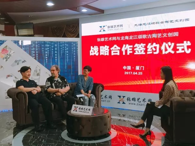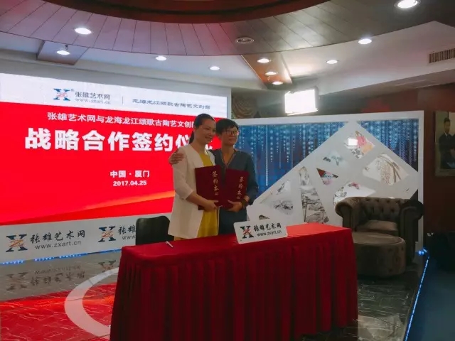 如何依托現(xiàn)有陶瓷資源,推動(dòng)傳統(tǒng)陶藝傳承,為傳統(tǒng)陶藝發(fā)展找到出路,是龍海市人民一直思考的問(wèn)題。為了更好地整合資源,讓互聯(lián)網(wǎng)與文創(chuàng)旅游產(chǎn)業(yè)進(jìn)行深度融合,2017年4月28日,張雄藝術(shù)網(wǎng)與龍江頌歌古陶藝文創(chuàng)園達(dá)成戰(zhàn)略合作協(xié)議,雙方在張雄書(shū)畫(huà)院美術(shù)館二樓演播廳舉行了簽約儀式。