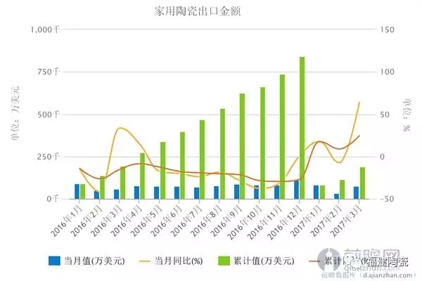 據(jù)前瞻數(shù)據(jù)庫數(shù)據(jù)顯示,2017年3月我國家用陶瓷出口金額為73154.4萬美元,當(dāng)月同比增長64%;1-3月累計(jì)出口家用陶瓷189617萬美元,累計(jì)同比增長24.4%。