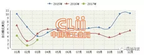 據(jù)海關(guān)數(shù)據(jù)顯示,2017年一季度我國(guó)陶瓷磚出口量?jī)r(jià)繼續(xù)回落,其中出口額下降幅度依然高于出口量降幅。據(jù)海關(guān)數(shù)據(jù)顯示,2017年1~3月我國(guó)陶瓷磚累計(jì)出口金額9.12億美元,同比下降38.22%;出口量1.83億平方米,同比下降11.40%。從連續(xù)三年月度出口額對(duì)比情況看,2017年一季度各月出口額均低于上兩年水平。