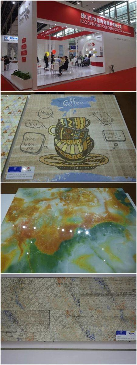 華意與司馬化工,均展出包裹墨水,由于包裹色料飽和度高,包裹墨水發(fā)色純正艷麗,讓瓷磚裝飾效果更富動感張力。紅色、黃色等系列作為常用的包裹顏料墨水,徹底突破傳統(tǒng)墨水發(fā)色或淺或暗、耐溫性差、基礎(chǔ)釉選擇挑剔等使用局限。