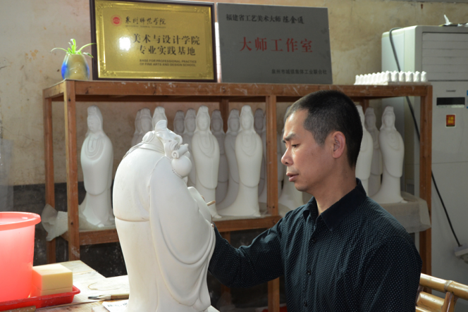 人物名片:陳金通,師從中國陶瓷藝術(shù)大師邱雙炯,高級工藝美術(shù)師、福建省工藝美術(shù)大師、福建省陶瓷藝術(shù)大師、德化縣第十屆政協(xié)委員、中國陶瓷工業(yè)協(xié)會理事、中國工藝美術(shù)學(xué)會會員、福建省工業(yè)美術(shù)協(xié)會理事、泉州市工藝美術(shù)協(xié)會理事。