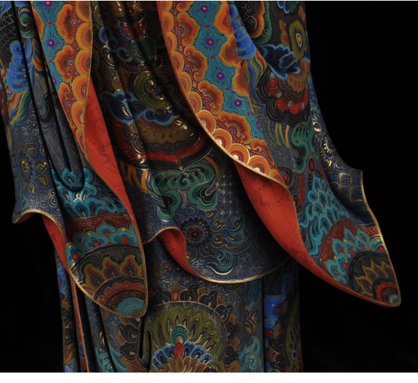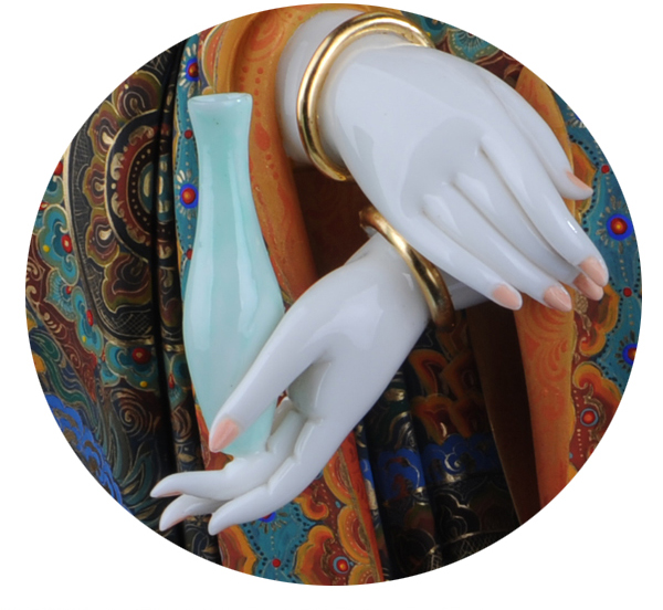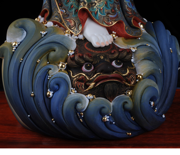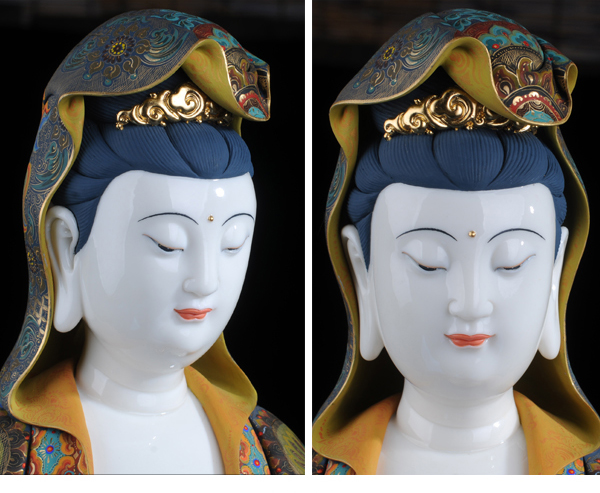 該作品彩用唐彩繪制,是德化白瓷與唐卡藝術(shù)相結(jié)合的突破,將天然礦物質(zhì)與瓷塑完美結(jié)合,華麗高貴,用天然的朱砂、黃金等為原料磨成色釉全手工描繪而成,極大提升了陶瓷藝術(shù)品獨(dú)特的藝術(shù)價值。歷史上的彩繪,多是釉上彩或釉下彩,該作品將陶瓷的彩與唐卡的繪畫工藝結(jié)合,避免了釉上彩和釉下彩的缺陷,使得作品既色彩鮮艷又完美和諧。此外,在進(jìn)行彩繪時也細(xì)致入微,勾線、填色、線面效果無不體現(xiàn)出技術(shù)創(chuàng)新,創(chuàng)新并不僅僅局限于唐卡藝術(shù)與陶瓷藝術(shù)的結(jié)合,也表現(xiàn)在其意念上,比如,粗料與細(xì)料的色彩運(yùn)用等。繪畫難度過大“如同菩薩修行,要經(jīng)得起重重考驗(yàn)和磨練方能成功”千年不褪色。
