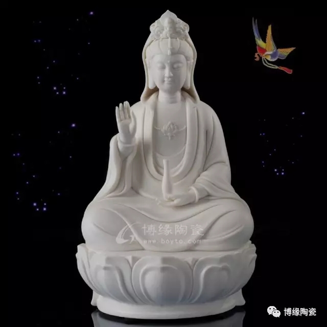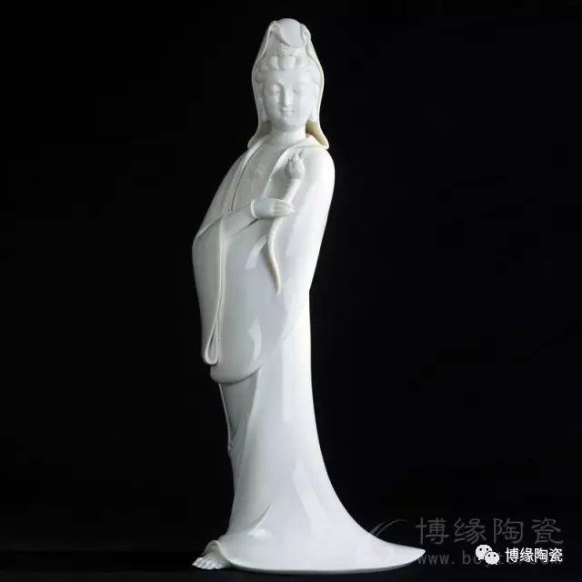 德化瓷器,以白瓷為最;白瓷之中,又以佛像為最。德化白瓷所塑佛像有性格鮮明、造型優(yōu)美、神態(tài)逼真、風(fēng)格洗練的特點(diǎn)。有一種單純的雕塑美和原材料的質(zhì)地美,最能體現(xiàn)佛教樸素、平和的思想。早在明代德化白瓷佛像就名聲在外,一代“瓷圣”何朝宗佛像名作流傳后世,成為世界各大博物館收藏的珍品,更對(duì)佛像雕塑史上產(chǎn)生深遠(yuǎn)的影響,形成“何派”雕塑,其開創(chuàng)的捏、塑、雕、刻、刮、削、接、貼八字技法延用至今。何派觀音雕塑注重于細(xì)節(jié)之美,精益求精,故而十分著意衣紋的刻畫,使線條流暢,翻轉(zhuǎn)自然。觀其佛像,仿佛有春風(fēng)拂面,衣袂飄揚(yáng)的出塵之感。