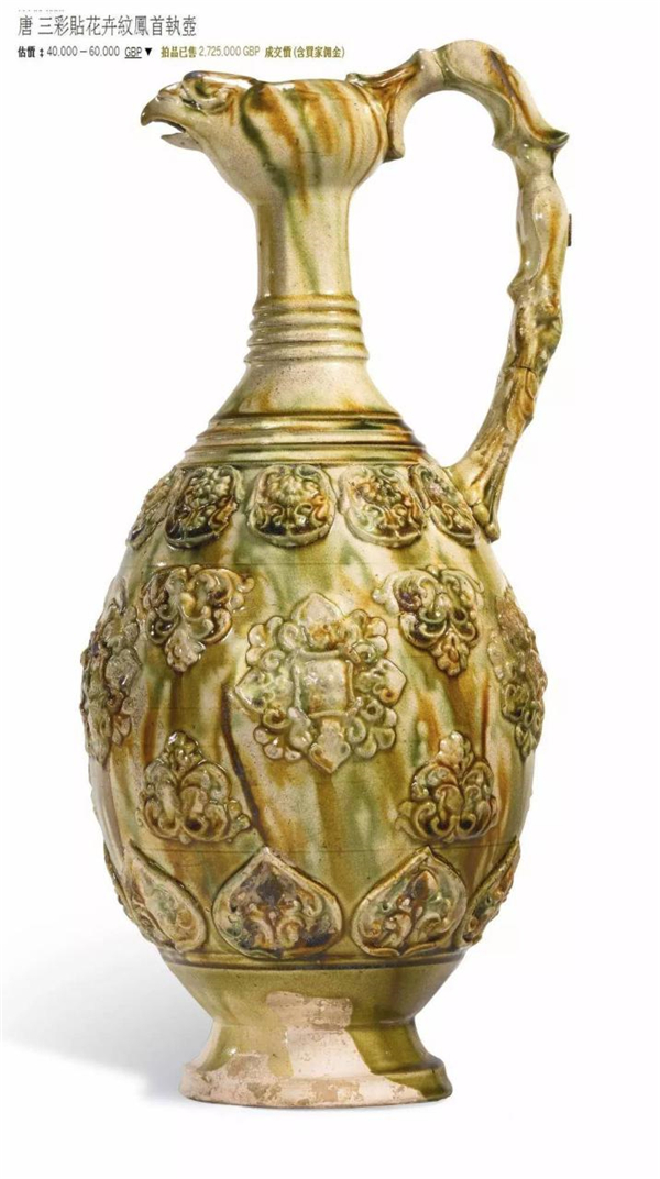 最近兩年拍賣市場上出現(xiàn)過一件明星級別的鳳首壺。2015年5月倫敦蘇富比春拍,一件將近37厘米高的三彩貼花卉紋鳳首執(zhí)壺以2,725,000英鎊,折合人民幣約2630萬的天價成交,由英國著名古董商Eskenazi買回。Eskenazi這個名字相信大家很熟悉,當(dāng)年引爆國內(nèi)元青花熱潮的標(biāo)志性事件——2005年倫敦佳士得的元青花鬼谷子下山大罐以折合人民幣2.3億的價格成交,就是出自他的手筆。這件蘇富比的拍品可以說代表了鳳首壺這個品種中的最高工藝和藝術(shù)水準(zhǔn),體量夠大,品相較好,加上有Eskenazi和繭山龍泉堂(日本著名的古董收藏經(jīng)營機構(gòu))的來源加持,又有《世界陶瓷全集》這種權(quán)威級別的出版記錄,市場追捧到這個價格也就不足為奇了。