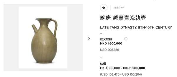 2016年6月香港佳士得拍出一件晚唐越窯青釉執(zhí)壺,成交價為160萬港幣,可做參考。