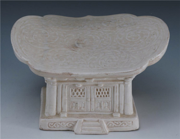 這件瓷枕通體施白釉,釉面滋潤,聚釉處呈淡水綠色,玻璃質(zhì)光很強,胎體細膩潔白。枕面作如意頭形,其上刻滿密而流暢的纏枝花卉紋,兩側(cè)微上翹,下承仿木結(jié)構(gòu)建筑的宮殿形平座,門窗門拱、基址臺階均雕刻得形象逼真,殿宇前門緊閉,后門半開,一人側(cè)立于門前,造型別致,獨具匠心。