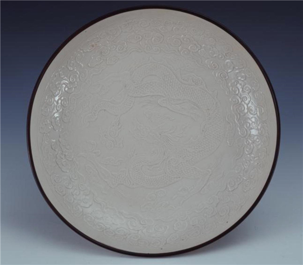 這類印花云龍紋盤的出土情況在陳萬里先生的《調(diào)查平原、河北二省古代窯址報告》一文中提及。1948年河北澗磁村附近的“法興寺”遺址,出土過這種印花龍紋盤十件,六件已流散到國外,其中有一件底部劃刻“尚食局”三字銘文?芍@類器物是北宋或金代宮廷里的專用品。