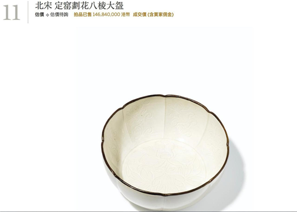 值得一提的是,雖然印花器是定窯的最著名品種,但目前定窯的拍賣紀(jì)錄保持者是一只劃花產(chǎn)品。2014年4月蘇富比香港拍出了一件定窯劃花八棱大碗,為日本著名古董商坂本五郎舊藏,成交價為146,840,000港元,為目前定窯產(chǎn)品中的最高價。