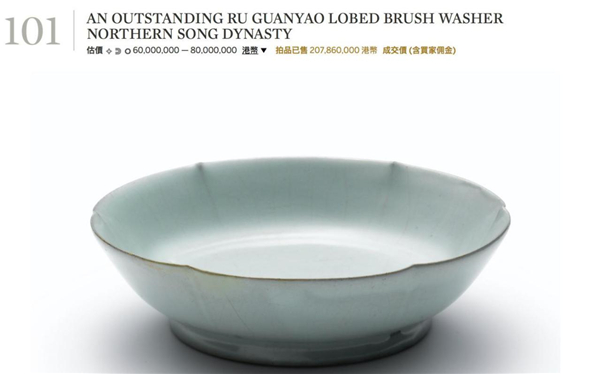 目前世界上已知的流傳有序且藏于私人之手的汝窯共7件,最近現(xiàn)世露面的一件是2012年4月香港蘇富比拍出的“北宋 汝窯天青釉葵花洗”,成交價為2.0786億港幣。它與大英博物館所藏汝窯洗原為一對,同屬克拉克夫婦的收藏,后輾轉(zhuǎn)流入日本繭山龍泉堂,最后由蘇富比拍出。