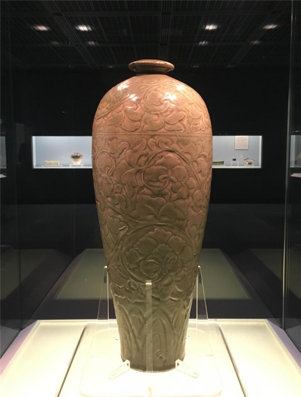 耀州窯瓷器是世界各大陶瓷博物館和美術(shù)館的重要收藏品種,如大阪市立東洋陶磁美術(shù)館有一件“北宋 青磁刻花牡丹唐草文瓶”,被日本極為看重,列入“重要文化財”(日語:重要文化財/じゅうようぶんかざい,是指根據(jù)文化財保護法,由日本政府的文部科學(xué)大臣指定的具有重要歷史價值和藝術(shù)價值的建筑、美術(shù)工藝品、考古資料、歷史資料等等物質(zhì)文化遺產(chǎn)。日本文化廳對其的官方英譯為:Important Cultural Properties)這一等級。這只唐草紋瓶與一般梅瓶的造型不同,又稱“吐嚕瓶”或“矮腳梅瓶”。