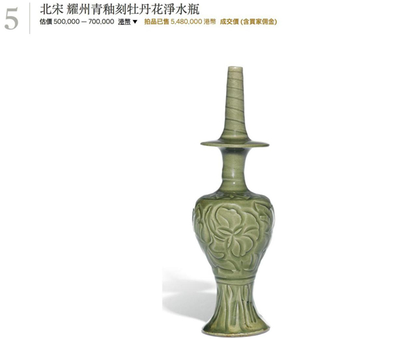 精品耀州窯同樣在公開市場上出現(xiàn)的很少,多見的是盤碗類的品種。近年出現(xiàn)的精品有2016年4月香港蘇富比的一件“北宋 耀州青釉刻牡丹花淨(jìng)水瓶”,成交價為548萬港元