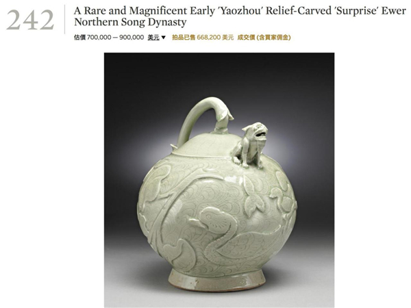 而耀州窯的歷史拍賣紀(jì)錄則要追溯到2007年9月紐約蘇富比的一件倒流壺,成交價為66.82萬美元,折合當(dāng)時人民幣為550多萬元。