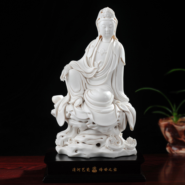 作品采用上等德化白瓷泥,經(jīng)1300多度高溫?zé)牵^音一改佛教造像直立或打坐的成規(guī),右腿曲蹲,左腳盤坐巖石,重心落在左胯,右手悠然自在輕放于右膝之上,左手為支撐點(diǎn),無拘無束,自由自在。其姿態(tài)出色地突現(xiàn)了觀音流暢的線條和優(yōu)美的身段。