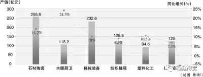 從六大產(chǎn)業(yè)分析來看,1-6月,石材陶瓷產(chǎn)值255.6億元,同比增長14.2%;水暖廚衛(wèi)產(chǎn)值118.2億元,同比增長24.3%;機(jī)械裝備產(chǎn)值232.6億元,同比增長10%;紡織鞋服產(chǎn)值125.8億元,同比增長8.5%;塑料化工產(chǎn)值94.6億元,同比增長10.5%;日用輕工產(chǎn)值125億元,同比增長7.4%。