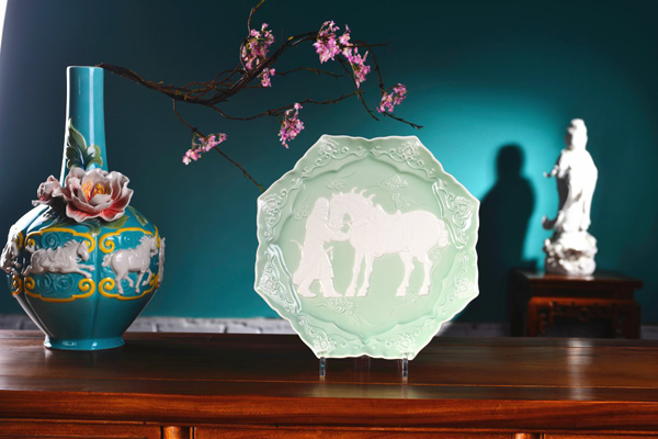 而在臺(tái)陜兩地文創(chuàng)機(jī)構(gòu)合作的作品中,以唐代昭陵六駿為核心元素的“富貴駿騰·唐六駿秘瓷瓷瓶”吸引了很多人的目光。該作品運(yùn)用浮雕工藝,形色取自現(xiàn)館藏于法門寺博物館,被譽(yù)為“瓷界西施”的唐代皇家御用秘色瓷八棱凈水瓶,頸部裝飾大唐國花牡丹,色青似水,靈動(dòng)潤澤,融優(yōu)雅、雄健、華麗于一體,寓意馬到成功,富貴平安,隆盛千秋。另一件“六駿錦程·唐六駿秘瓷瓷盤”中每匹馬均采用浮雕工藝,并結(jié)合唐代寶相花銅鏡造型以云紋襯底燒制成盤,用現(xiàn)代方式完美復(fù)現(xiàn)了原石刻的風(fēng)采,凸顯出了昭陵六駿雄壯豐肥的肌骨、矯捷如飛的英姿、神武不凡的氣勢(shì),象征著繁榮昌盛,前途萬里,馬踏云程。